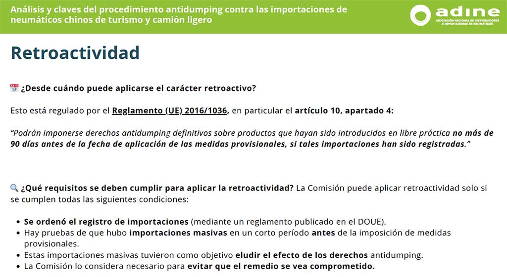 Tras un detallada presentación de Óscar Bas sobre los productos afectados y el calendario del procedimiento antidumping -ver infogragrías adjuntas-, Clark Freed señaló que “existen subvenciones del gobierno de China a sus fabricantes para producir y exportar, y si todos defendemos las mismas reglas en el mercado, las autoridades europeas deben proteger el antidumping. La UE va a perseguir y poner trabas al antidumping para actuar todos con las mismas reglas. En el mercado no he visto que esto haya trascendido al consumidor, que dentro de unos meses puede encontrarse con escasez de neumáticos o subidas de precios. Ya se está notando un aumento de compras de neumáticos chinos en base a hipótesis, pero eso también es un aumento del riesgo. El impacto en precio va a ser claro e importante. Nosotros necesitamos que el valor del neumático sea adecuado para que los coches sigan rodando, y si suben los precios es un riesgo. El sector tiene miedo a la retroactividad, porque es muy difícil dirigir una empresa con esta incertidumbre. El riesgo de retroactividad es alto porque los datos recogen un aumento de las importaciones. Es un problema serio. A corto plazo, no se saben bien los efectos y los mercados se regulan solos, pero a largo plazo subestimamos la capacidad de los empresarios chinos, que son más rápidos e intuitivos que los europeos, y cambian el lugar de producción. El antidumping no será real a largo plazo porque ellos trasladarán la fabricación a otros países e importaremos de otras zonas”.