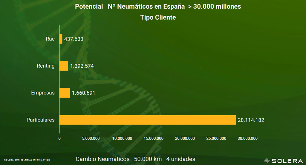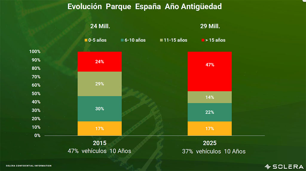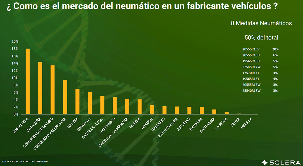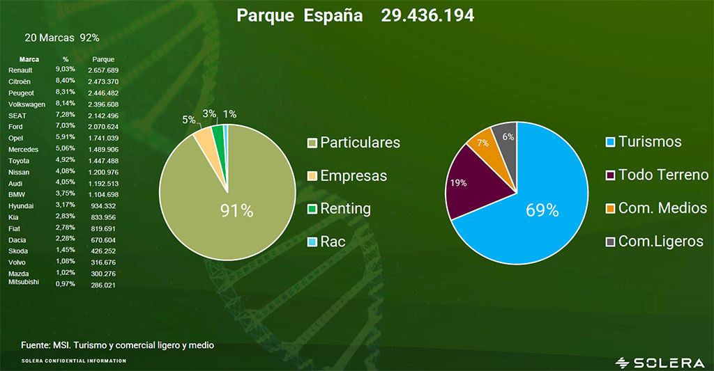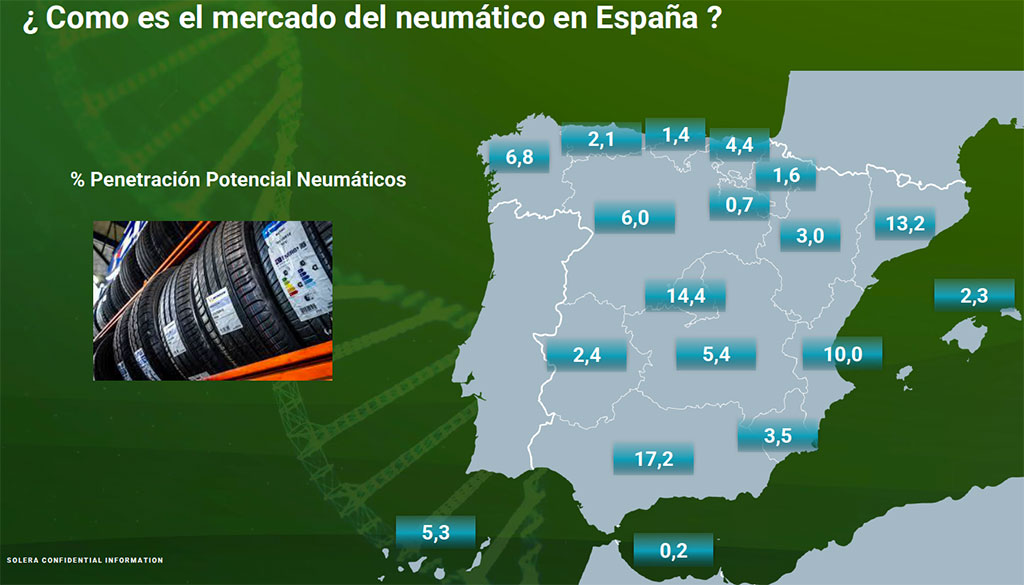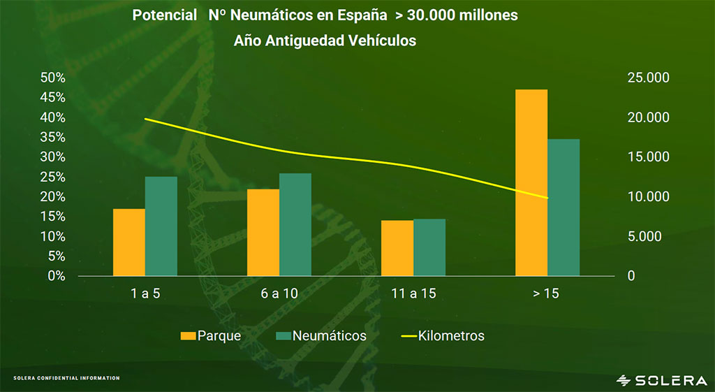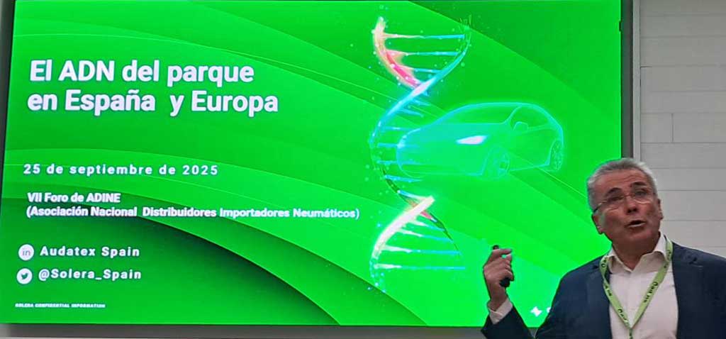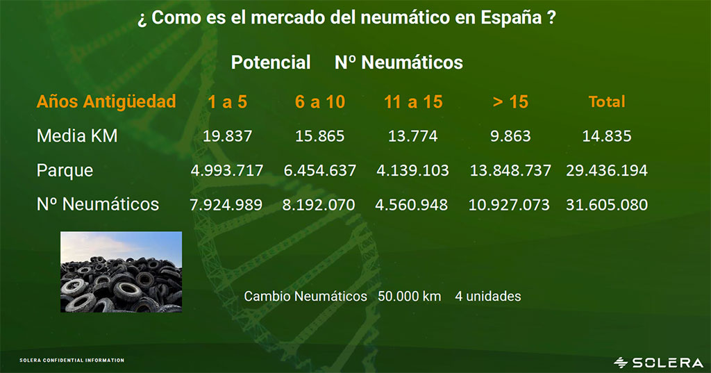 Acto seguido, José Luis Gata, Business Development Manager de Solera, hizo una detallada y enriquecedora radiografía sobre “El ADN del Parque y Posventa en España” -ver infografías adjuntas- y su incidencia en la demanda de neumáticos. Gata señaló que “el potencial del mercado podría superar las 31 millones de unidades en España” y destacó “el papel creciente de la electrificación como oportunidad de negocio para el mantenimiento preventivo”.