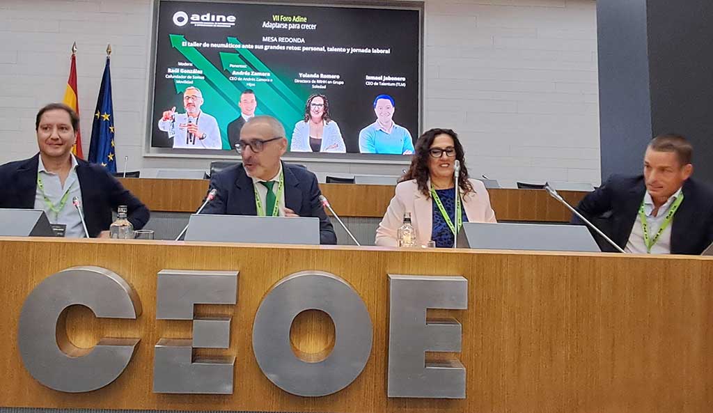 Sin duda, uno de los platos fuertes del VII Foro ADINE fue la mesa redonda titulada “El taller de neumáticos ante sus grandes retos: personal, talento y jornada laboral”, moderada por Raúl González (Somos Movilidad), con la participación de Andrés Zamora (Andrés Zamora e Hijos), Ismael Jabonero (Talentum) y Yolanda Romero (Grupo Soledad), cuyas intervenciones vinieron a enmarcarse dentro del lema del Foro, ‘Adaptarse para crecer’. Sí, porque abordaron los desafíos del talento, la formación y la gestión de la jornada laboral en los talleres especializados en neumáticos, reconociendo el problema de la escasez de mano de obra: cualificada e, incluso, hasta sin cualificar.