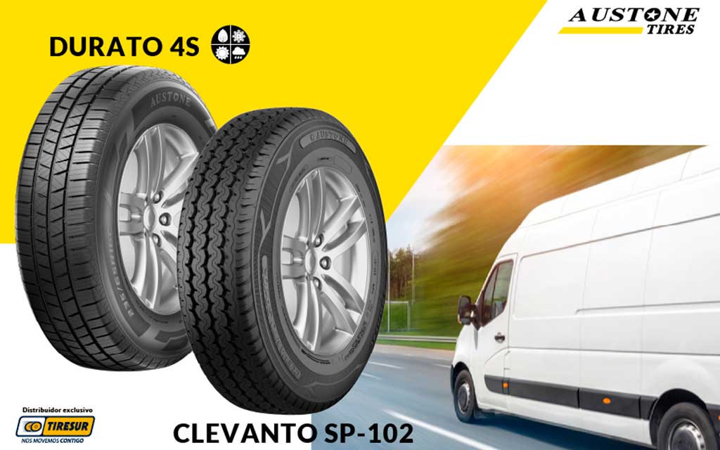 Tiresur señala en su comunicado que “incorpora a su catálogo dos nuevas referencias de la marca Austone, distribuida en exclusiva por Tiresur, para el segmento profesional: Durato 4S y Clevanto SP-102, ampliando así su oferta de neumáticos para vehículos comerciales y servicios de reparto”.