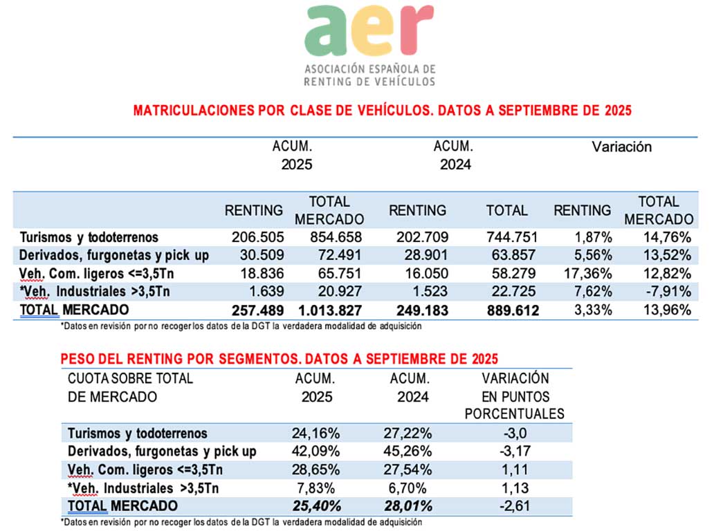 El renting de vehículos en España sigue creciendo. Lo dicen los datos de AER. Sí, porque poniendo en contexto, según la Asociación Española de Renting de Vehículos, “las matriculaciones de vehículos registradas por las compañías de renting, al cierre de septiembre de 2025, se cifran en 257.489 unidades, un 3,33% más que en el mismo periodo de 2024, cuando se contabilizaron 249.183 vehículos. En cuanto a los resultados del mercado total en España, las matriculaciones registran un incremento del 13,96%, con 1.013.827 unidades matriculadas a septiembre de 2025. El peso del renting en el total de las matriculaciones en el acumulado a septiembre de 2025 es del 25,40%, mientras que, en el mismo periodo de 2024, era del 28,01%. El segmento de vehículos donde más representación tiene el renting es el de derivados, furgonetas y pick up, en el que el sector copa el 42,09% del mercado”.
