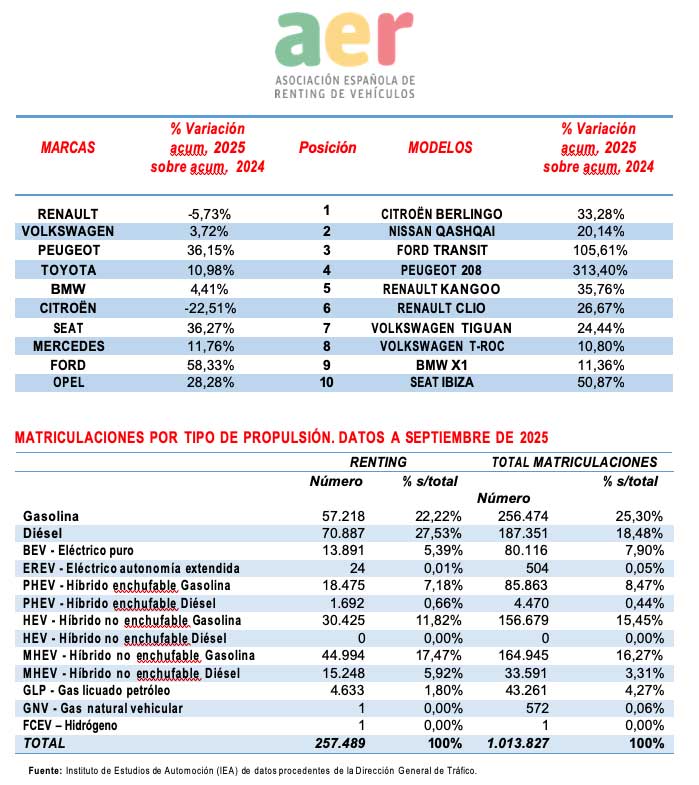 Detallando aún más los datos, AER precisa que “las 10 marcas más matriculadas en renting en el canal de empresa, a septiembre de 2025, han representado el 68,49%, frente al 68,03% que coparon a septiembre de 2024. Estas firmas han incrementado sus matriculaciones un 10,10% mientras el canal de empresa en renting crece un 9,36%. En lo relativo a los 10 modelos más demandados en renting, a septiembre de 2025, estos han acaparado el 23,14% del total de vehículos matriculados en renting en el canal de empresas, mientras que, en ese periodo de 2024, supusieron el 17,81%. Estos 10 primeros modelos han incrementado sus matriculaciones un 42,08%, cuando este canal, como se ha dicho, crece un 9,36%”.