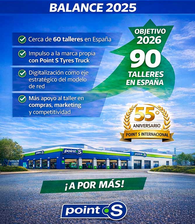 “2025 ha sido un año clave para sentar las bases del crecimiento futuro de la red, con una apuesta clara por la profesionalización, la diversificación y la digitalización, siempre con el objetivo de ayudar a nuestros talleres a ser más competitivos en un entorno cada vez más exigente”. Son palabras de Luis Luis Miguel Muñoz, director de desarrollo de Point S, red de talleres independientes especialistas en neumáticos y mantenimiento de vehículos, que ya roza los 60 centros abanderados en España, con el objetivo de alcanzar en 2026 los 90 talleres, en el año en que Point S internacional celebra su 55º aniversario.