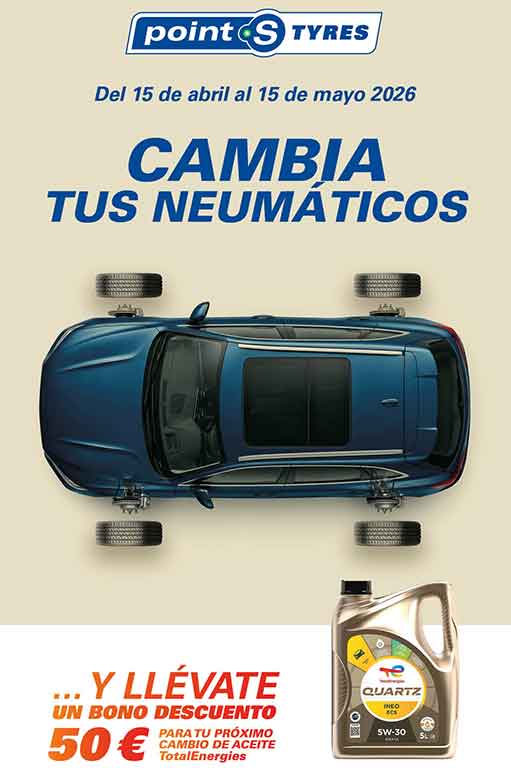 La red de talleres independientes Point S España, liderada por Luis Miguel Muñoz como director general, acaba de anunciar el lanzamiento de una campaña promocional junto a TotalEnergies “para reforzar la actividad y la rentabilidad de la red en España”, según la cual “aquellos clientes que monten cuatro neumáticos Point S TYRES entre el 15 de abril y el 15 de mayo de 2026 recibirán un cupón de 50 euros para su próximo cambio de aceite con lubricantes TotalEnergies, canjeable hasta el 30 de agosto en el mismo taller”.