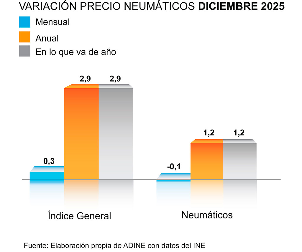 Al igual que en 2024, el precio de los neumáticos se encareció un 1,2% interanual durante 2025 en el mercado español, y vuelve a situarse 1,7 puntos porcentuales por debajo del IPC general, que cerró el pasado ejercicio en un +2,9%, según un estudio elaborado por ADINE –la Asociación Nacional de Distribuidores e Importadores de Neumáticos que representa a más del 80% del sector de la distribución de neumáticos a nivel nacional, contando entre sus actuales 122 empresas asociadas con distribuidores e importadores, además de fabricantes y talleres de neumáticos-, basado en los datos definitivos del Instituto Nacional de Estadística (INE).
