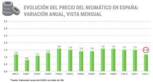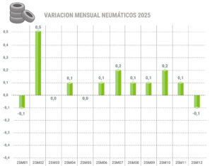 Tal y como se puede apreciar en el gráfico superior elaborado por ADINE, “en términos mensuales, la evolución del precio de los neumáticos en 2025 se ha caracterizado por variaciones muy contenidas durante prácticamente todo el año: