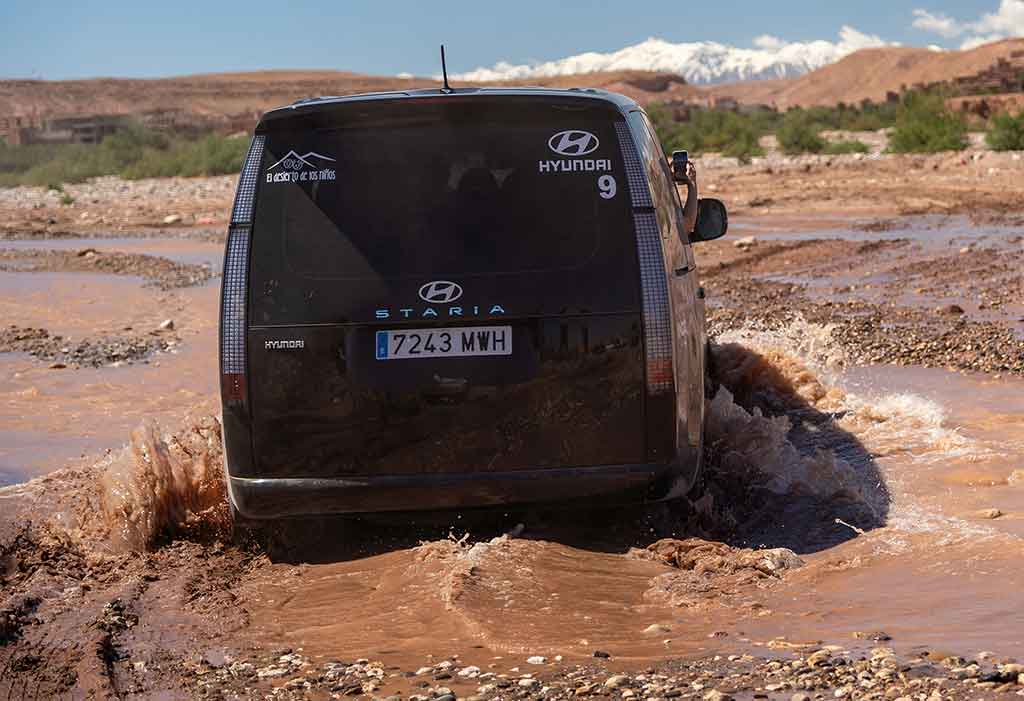 Como explicaron los organizadores, “con 42 vehículos y 146 personas, ‘El Desierto de los Niños 2026’ arrancaba con el paso del estrecho desde Tarifa a Tánger, donde la travesía se pudo llevar a cabo con total normalidad. Y es que el tiempo ha vuelto a ser protagonista del viaje, ya que las fuertes lluvias del último mes en la zona obligaron a cambiar ubicaciones y recorridos, en algunos casos sobre la marcha, o a retrasar acciones previstas para este año. Así, en algunos puntos del recorrido, la caravana se encontró con caminos que habían desaparecido por el paso del agua, lo que obligó a buscar alternativas campo a través. Con estas complicadas condiciones salió a la luz el excelente trabajo que realizan los modernos sistemas de tracción que equipan los HYUNDAI que encabezan la caravana. Los SANTA FE, KONA, TUCSON y IONIQ 9 pasaron la prueba, demostrando unas cualidades impresionantes”.