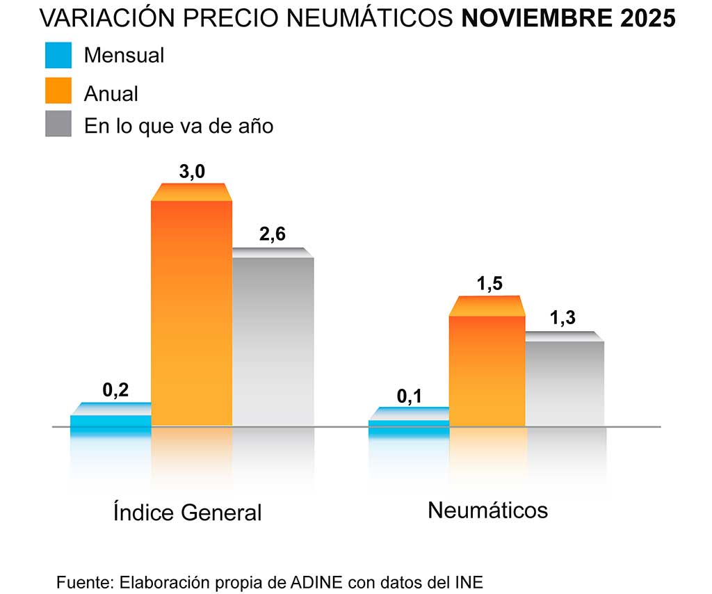 No obstante, en comparativa interanual (de noviembre 2024 a noviembre 2025), ADINE detalla en su comunicado que “el precio de los neumáticos en España registró una subida interanual del 1,5% en noviembre de 2025, según los últimos datos publicados por el Instituto Nacional de Estadística (INE) y analizados por la Asociación Nacional de Distribuidores e Importadores de Neumáticos (ADINE). Esta evolución mantiene los precios claramente por debajo del Índice de Precios al Consumo (IPC) general, que se situó en el 3% en el mismo mes. En comparación con noviembre de 2024, cuando la tasa de variación interanual fue del 1%, el precio de los neumáticos muestra un incremento de cinco décimas, lo que confirma una tendencia de crecimiento moderado y controlado, muy alejada del comportamiento del índice general de precios”.