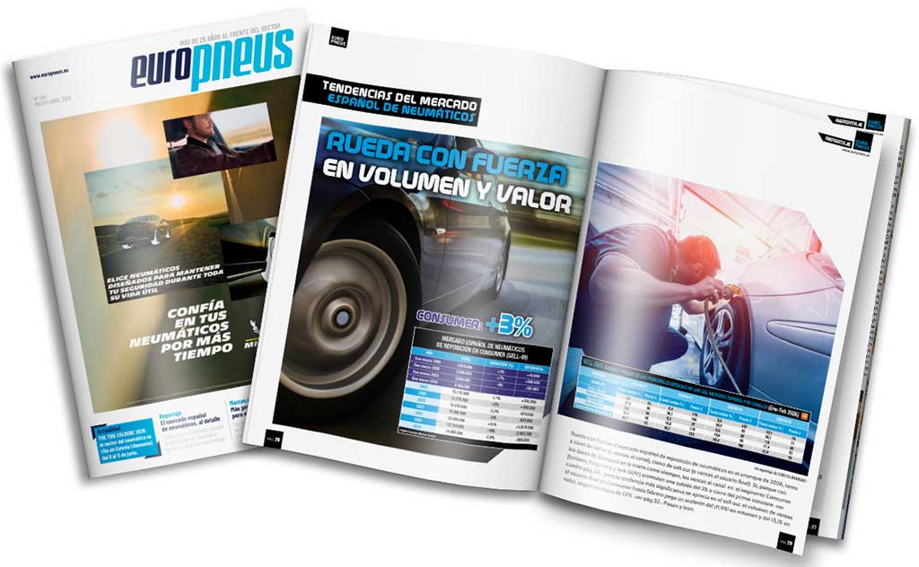 “Rueda con fuerza en volumen y valor”. Así titula ‘Europneus’ el reportaje de su ya tradicional radiografía al detalle sobre la evolución y tendencias del mercado español de reposición de neumáticos en este arranque de 2026, que publica en su reciente número impreso 294 de marzo-abril con todos los datos de volumen y valor, tanto a nivel de sell in (o ventas al canal: Europool, a cierre de marzo) como de sell out (o ventas al usuario final: GFK, hasta febrero), dentro del segmento consumer (turismo, furgoneta y 4×4-SUV), y también sobre la evolución del precio de los neumáticos a cierre del primer trimestre, según ADINE. Radiografía que salta del papel a esta ventana digital universal. Pasen y lean.