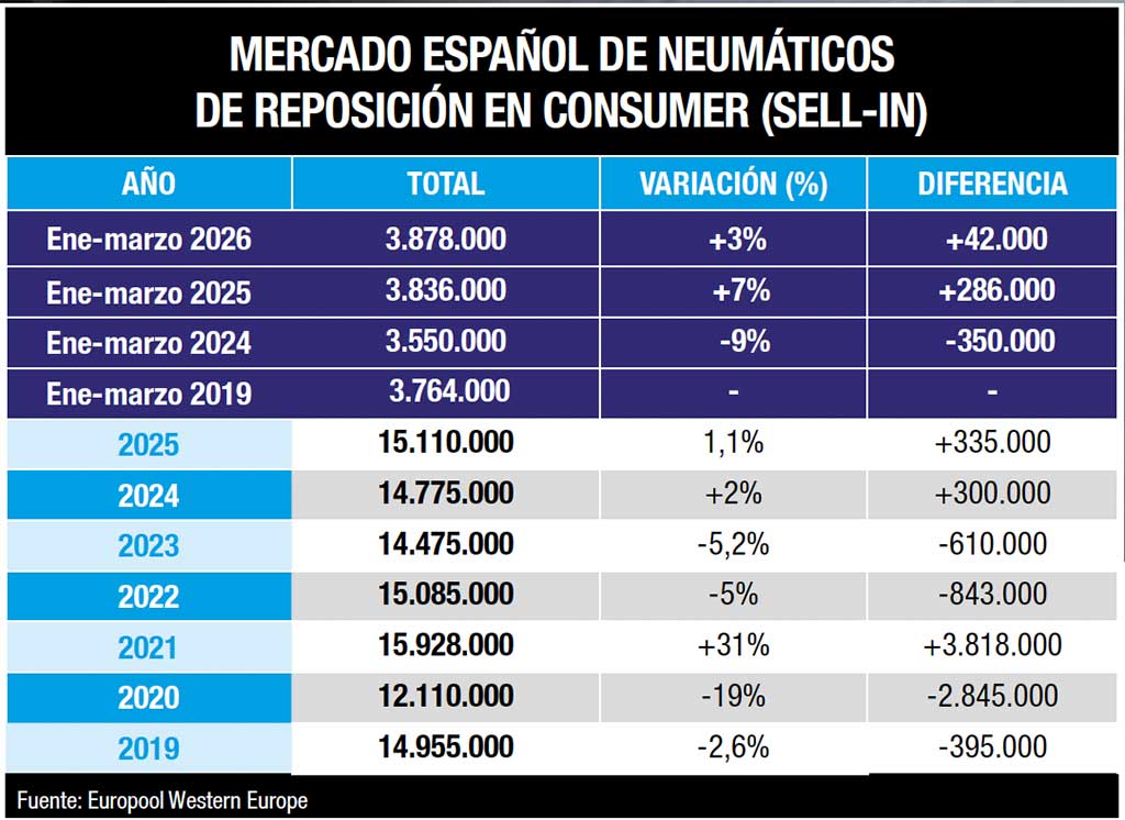 Rueda con fuerza el mercado español de reposición de neumáticos a tenor de los datos más recientes de Europool (ventas al canal), como de GFK (ventas al usuario final). No en vano, las ventas al canal vía Europool en Consumer acumulan una subida del 3% a cierre del primer trimestre con una cifra que supera los 3.878.000 unidades y supone un incremento interanual de unas 42.000 cubiertas, pero lo más significativo es que refuerza la tendencia alcista al sumarse al subidón del 7% ya vivido por el mercado hace un año cuando creció en más de ¡286.000 neumáticos!