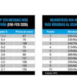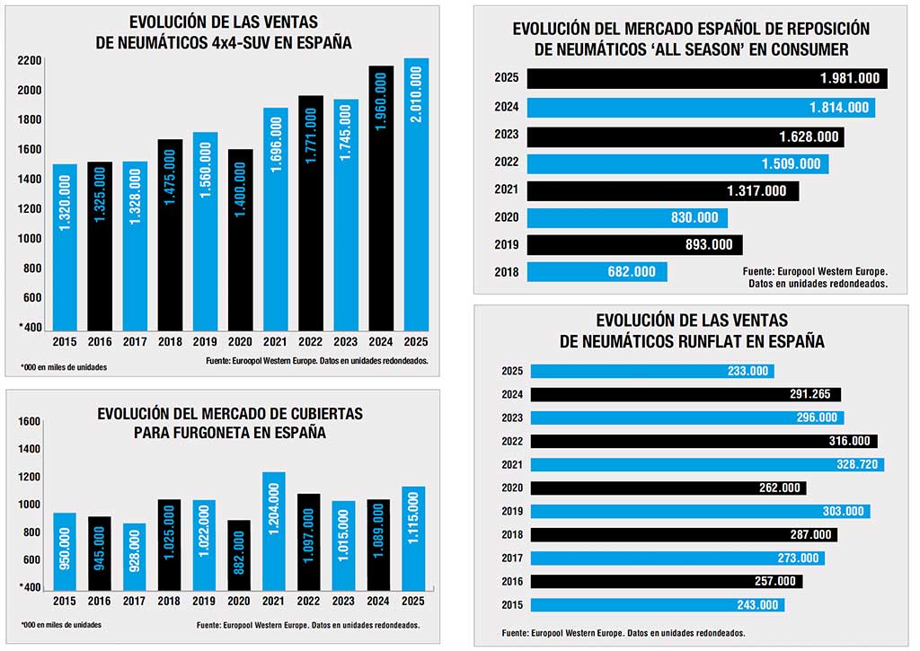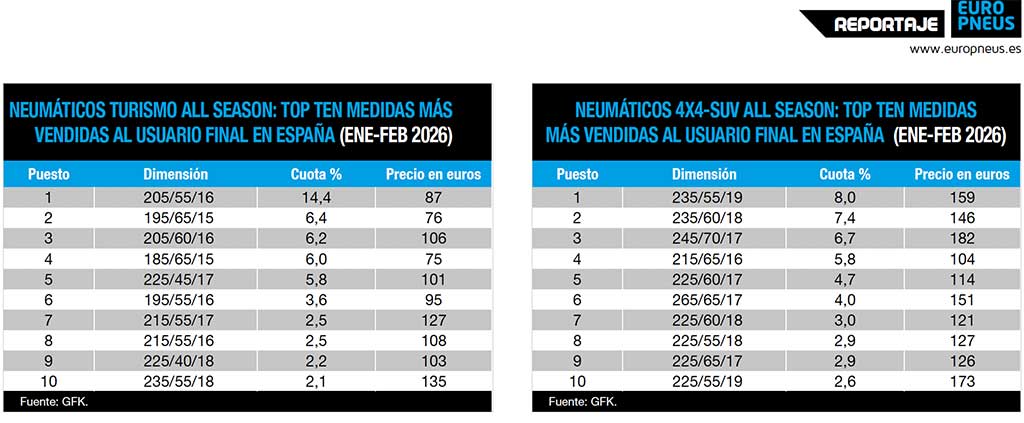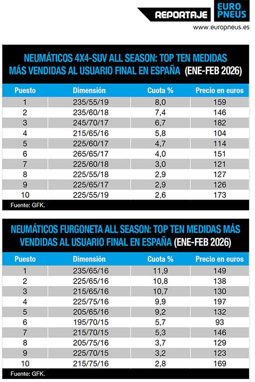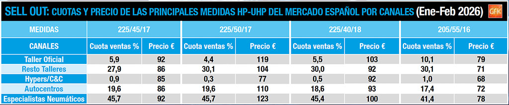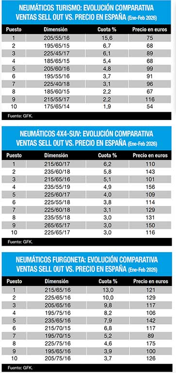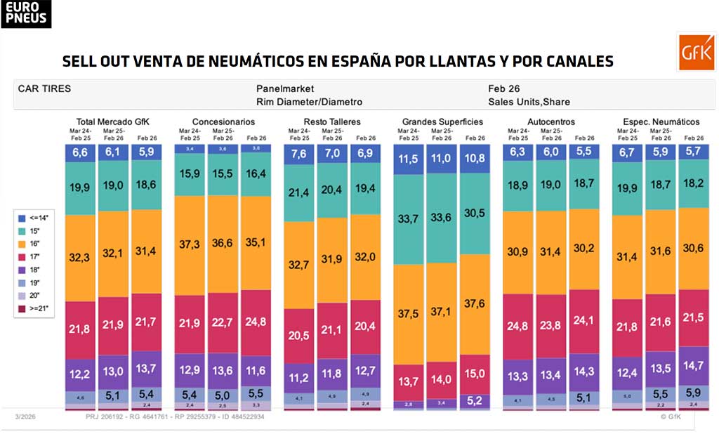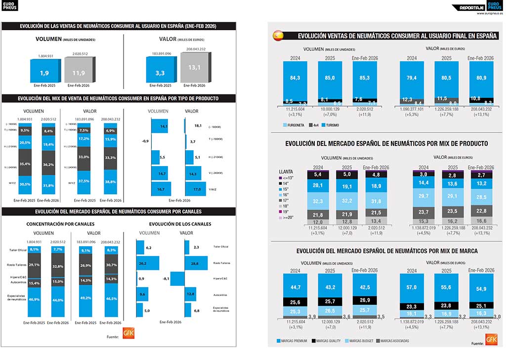 Pero si el mercado español de reposición de neumáticos en Consumer rueda con una fuerza del 3% a cierre del primer trimestre en las ventas al canal, se multiplica casi por cuatro en las ventas al usuario final (sell out), pues los datos de GFK a cierre de febrero en consumer -ver pag. 32- recogen una subida del 11,9% en volumen (2.020.512 vs. 1.804.931 en 2025: ¡215.581 neumáticos más!) y un acelerón del 13,1% en valor (208.043.232 euros vs. 183.891.096 euros en 2025: ¡241 millones de euros más!). Por categorías, Turismo sube del 85% al 85,3% en volumen y del 80,5% al 80,9% en valor, pero 4×4-SUV baja del 8,1% al 7,6% y del 11,5% al 10,8%, repectivamente.