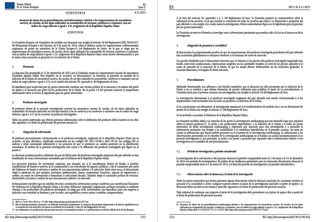 Y añade que “según el anuncio, la denuncia fue presentada en septiembre por la Coalition Against Unfair Tyre Imports, en nombre de la industria de la Unión, alegando que los fabricantes chinos se habrían beneficiado de ayudas públicas y condiciones preferenciales en materia de financiación, fiscalidad o acceso a insumos, lo que podría constituir una ventaja competitiva desleal”.