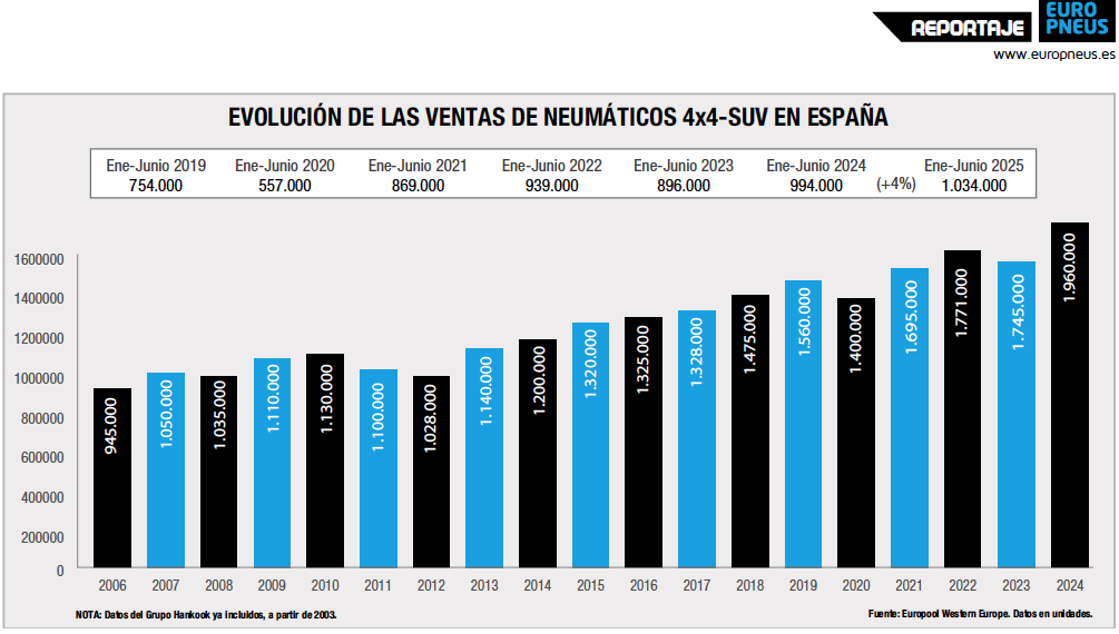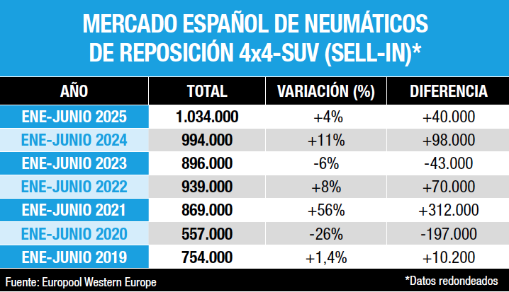 A cierre de junio, Europool confirma el crecimiento imparable en el segmento de neumáticos 4×4-SUV, al acumular una subida del 4% y una cifra próxima a 1.034.000 unidades, unas 40.000 más respecto a hace un año.