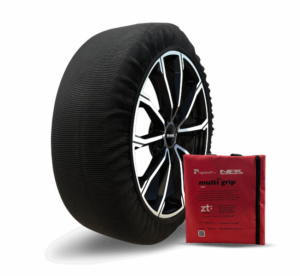 - Multigrip The Original.- Cadenas textiles de gama alta, con una banda lateral funcional de color en ambos hombros del neumático que permite que el dispositivo se centre automáticamente durante la instalación. Esta característica lo convierte en un producto a medida disponible en numerosos tamaños y aplicaciones. La alta calidad y el grosor del material textil es perceptible al tacto.